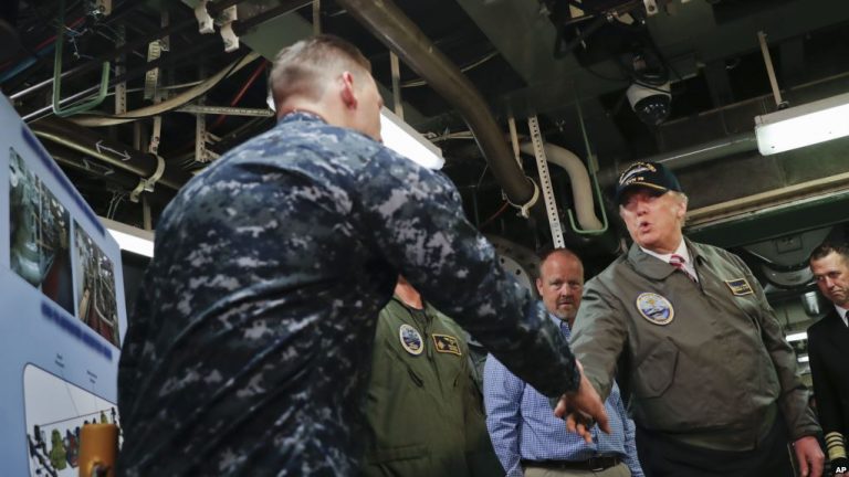 (VOA noticias). 3 marzo – Parado sobre un poderoso portaaviones en Newport News, Virginia, el presidente Donald Trump se comprometió a fortalecer la armada estadounidense.